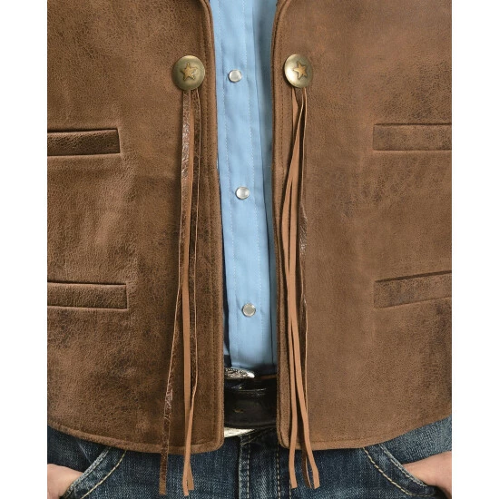 - Front placket features two conchos with stars; fringe dangles from conchos